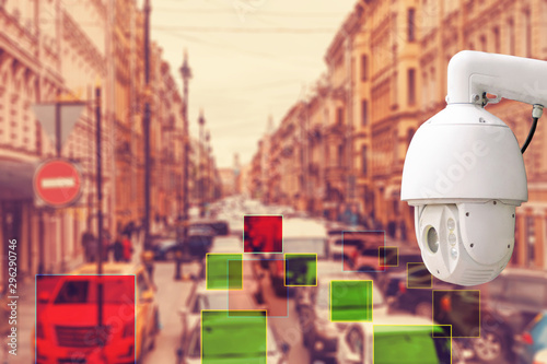 The concept of video surveillance and traffic violations. CCTV camera found the violator of traffic, highlighting the car in red. Definition zone. Tint