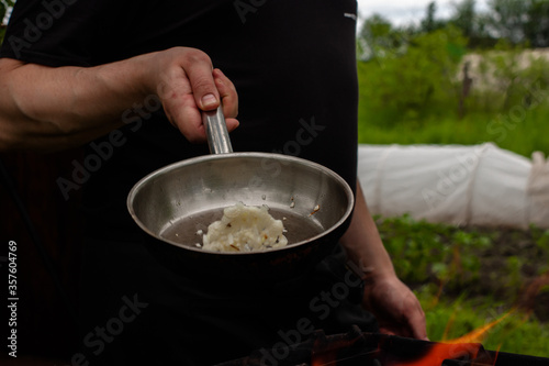 the cook is FRYING onions in a frying pan over the fire. camp kitchen on the grill