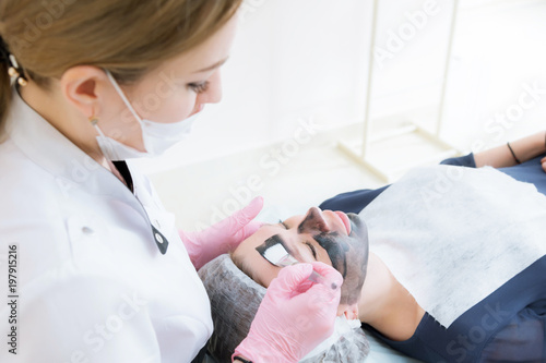 The cosmetologist in pink gloves with a brush applies a carbon mask for peeling on the face of a young girl in a cosmetology room. The concept of cosmetology services and self-care. The concept of