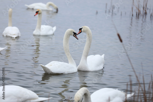 The couple of swans with their necks form a heart. Mating games of a pair of white swans. The mute swan, latin name Cygnus olor. Swans swimming on the water in nature. Valentine's Day background.