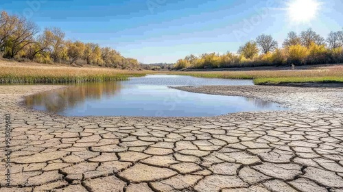 riverbed, drought, cracked, earth, global, warming, dry, weather, shallow, puddle, tree, vegetation, sun, landscape, climate, change, environmental, impact, nature, ecology, water, scarcity, dirtied, wildlife, habitat, season, ecosystem, agricultural, land, conservation, ground, texture, puddle, green, plant, barren, sunny, day, river, natural, resource, deforestation, awareness, arid
