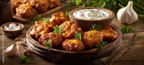 food, cookery, snack, platter, herb, garlic, sauce, dip, vegetarian, fried, tasty, garnish, rustic, homemade, dining, meal, comfort, favor, epicure, fresh, receipe, culinary, table, traditional, healthy, ingredient, organic, spice, serving, party, round, wooden, dish, chef, indian, aromatic, exotic, wide