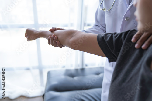 The doctor counsels the patient about pain in the muscles of the arms and elbows. office syndrome problem physical therapy diagnostic concept