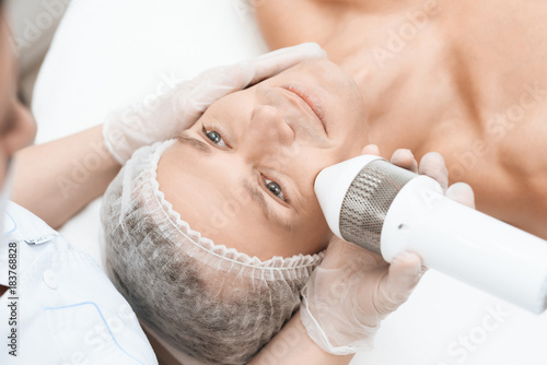 The doctor treats the skin of a man with a modern photoepilator.