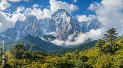 The dramatic cliffs and glaciers of Jade Dragon Snow Mountain, with clouds swirling around the jagged peaks and rugged terrain beneath