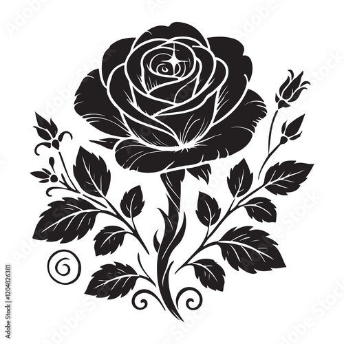 The Enchanted Rose Silhouette Vector Illustration, Solid White Background.