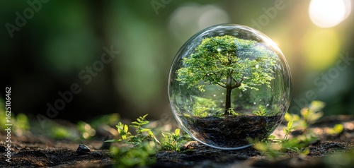 The enchanting tree surrounded by a glass globe in a lush forest setting
