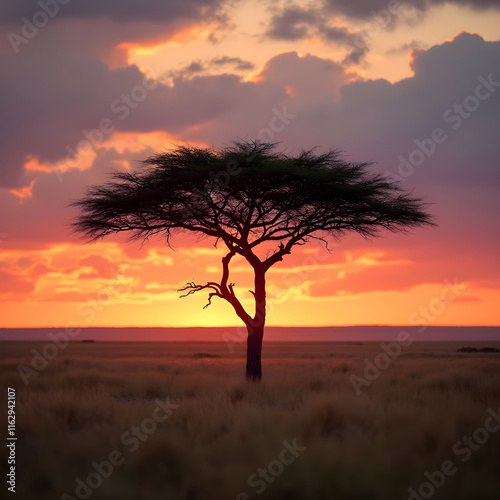 The endless horizon of the Serengeti, with a single acacia tree silhouetted against the sky.