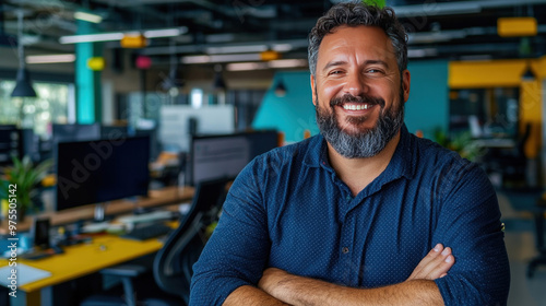 The engineer confidently smiles in an office filled with technology, embodying the future of engineering.