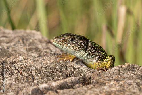 The European green lizard, Lacerta viridis, warming up on the summer sunlight