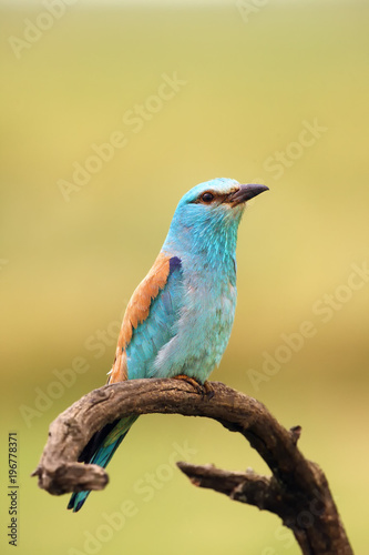 The European roller (Coracias garrulus) sitting on the branch with green background.