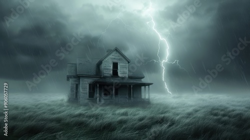 The exterior of a haunted house during a thunderstorm, with lightning illuminating the spooky facade