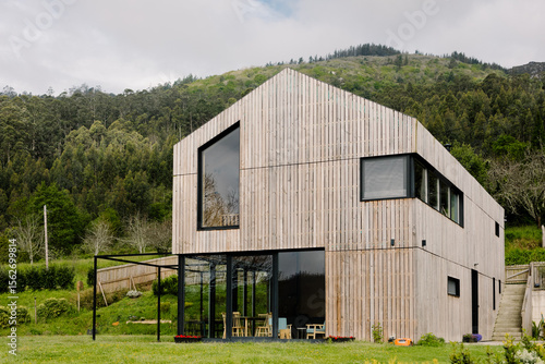 architecture, building, calm, cloudy, day, eco, environment, exterior, facades, forest, greenery, home, house, landscape, minimal, modern, nature, overcast, panoramic, peaceful, remote, retreat, rural, scenic, shelter, structure, sustainable, tree, view, window, wooden