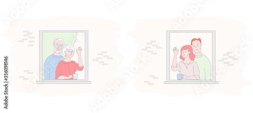 The facade of the house with open windows. The neighbors greet, wave their hands and drink tea. An elderly couple and a young family communicate. Friendship, stay at home, communication. The concept