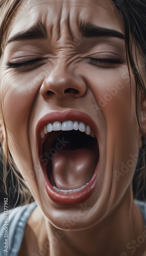 face, screaming, girl, mouth, wide, open, eye, closed, wrinkled, emotion, design, detail, effect, portrait, closeup, adult, expression, sharpened, human, light, look, concept, mystery, pattern, people, skin, texture, vision, white, black, grey, feeling, mood, psychology, position, sense, sentiment, reaction, impression, excitement
