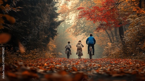 autumn, bicycle, family, nature, adventure, outdoors, forest, tree, foliage, landscape, children, leisure, relaxed, exploration, scenery, seasonal, path, sunlight, joy, activity, friendship, togetherness, freedom, calmness, red, orange, yellow, biking, beautiful, fresh, morning