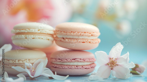 The famous dessert Macaron, macaroons with filling inside, a masterpiece of culinary art, an unusual background. For any special occasions.