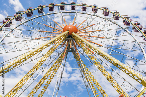 wheel, ferris, sky, background, blue, park, cloudy, fun, view, travel, abstract, entertainment, ride, colours, structure, high, steel, fair, funfair, fairground, summer, circle, play, festival, carnival, holiday, up, big, joy, symbol, dream, radial, cloud