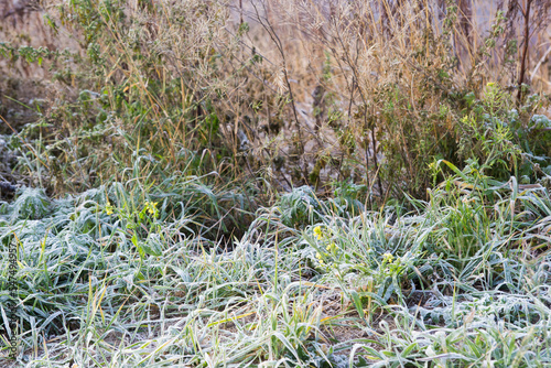 The first frosts. Green bushes and grass in frost. The first frost in the mountain forest.