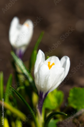 The first spring flowers bloom in the garden against a blue sky. White crocuses grow in early spring.