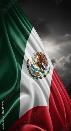 The flag of mexico is displayed against a dramatic sky with dark clouds.