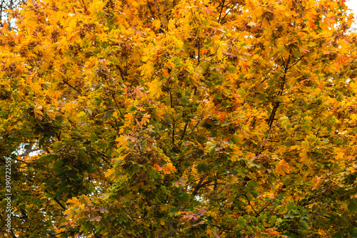 The foliage of a tree with yellow leaves, at an Autumn day in a park.