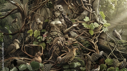 forest, nymph, nature, tree, root, branch, leaf, green, magical, mystical, fantasy, mythical, timberland, spirit, goddess, aethereal, delicate, elegant, beauty, surreal, bird, wildlife, fairy tale, dreamlike, enchanted, artwork, digital artwork, illustration