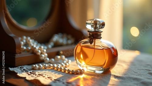 vintage, romance, nostalgia, antique, perfume, bottle, scent, fragrance, memory, victorian, edwardian, art deco, boudoir, vanity, dresser, mirror, lace, silk, pearl, love, couple, human relationships, past, aged, texture, faded, elegant, ornate, detailed, photorealistic, still life, bokeh, soft focus, warm light, golden hour