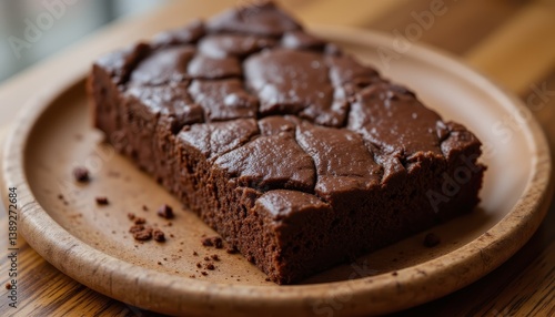 The freshly baked chocolate dessert on a wooden plate is a decadent and irresistible treat