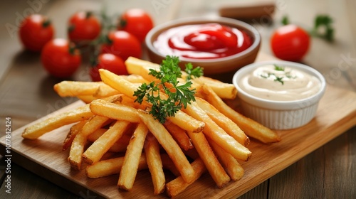 food, fries, ketchup, mayo, tomatoes, snack, meal, delicious, wooden, plate, garnish, fast food, cookery, crispy, gold, side, fresh, unhealthy, comfort, culinary, tasty, savoury, eatery, serving, eatery, epicure, casual attire, dining, group