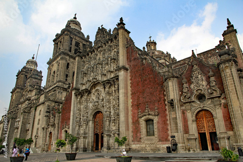 mexico, city, cathedral, central, square, main, aztec, travel, vacation, architecture, spanish, front, facing, entrance, tower, brick, red, blue, metropolitan