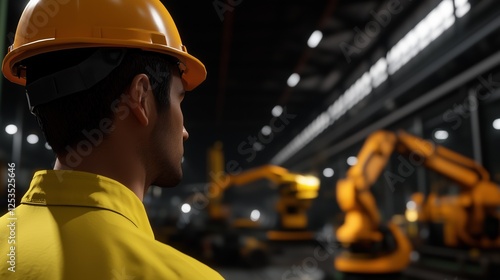 The Future of Manufacturing: A lone worker in a yellow hard hat and safety wear stands in a modern factory, looking towards a row of industrial robots in the background.
