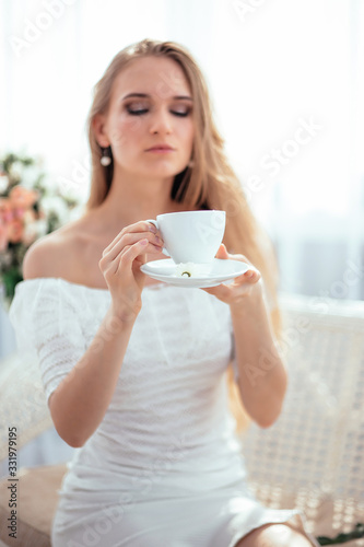 The girl drinks morning tea and enjoys life, admiring a bouquet of flowers .