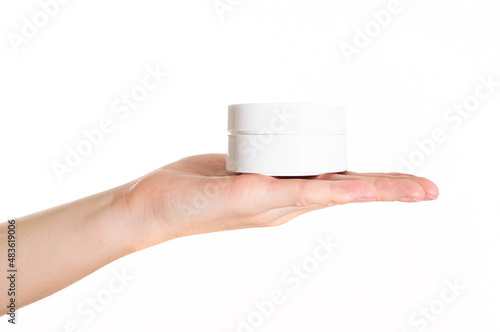 The girl holds a white jar of cream on a white background