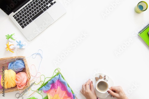 The girl knits the colored canvas with knitting needles. Laptop, basket with skeins of yarn, coffee, tea and water with lemon.