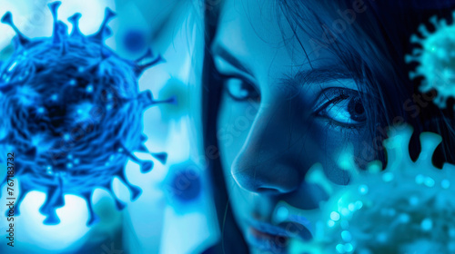 the girl looks into the frame, round disease viruses fly around her, antibodies, blue tone