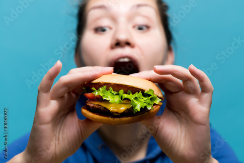 the girl opened her mouth and is going to eat her burger, which she holds in her hands. Selective focus