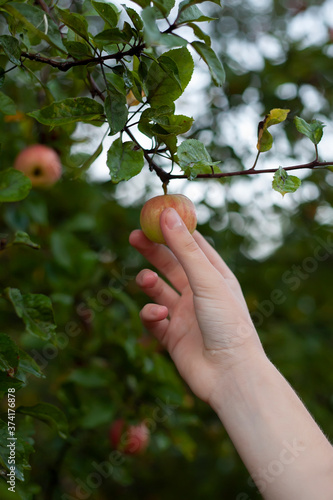 The girl picks an apple from the tree to taste it. The apple tree grows in the forest.