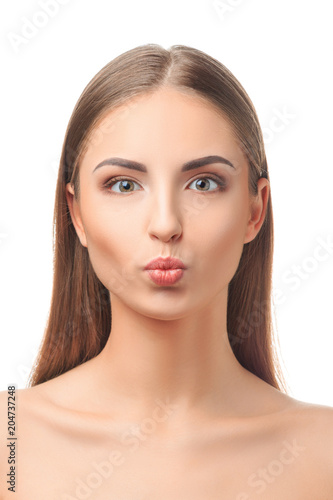 girl, beautiful, lip, kiss, sensual, surprised, woman, emotional, skin, face, hair, eye, look, young, white, background, isolated