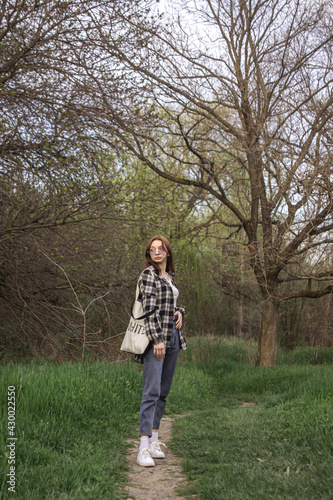 The girl walks along the path in nature. Spring walk through the woods. Girl teenager on the background of nature