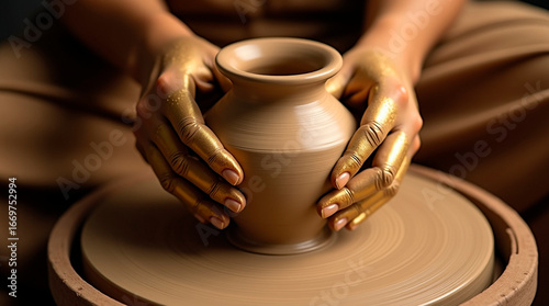 the golden hands of a potter make a jug from clay on a potter's wheel, hand made