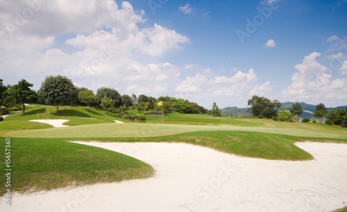 golf, grass, green, nature, park, plant, blue, clear sky, cloud, flag, landscape, leaf, sunny, tree