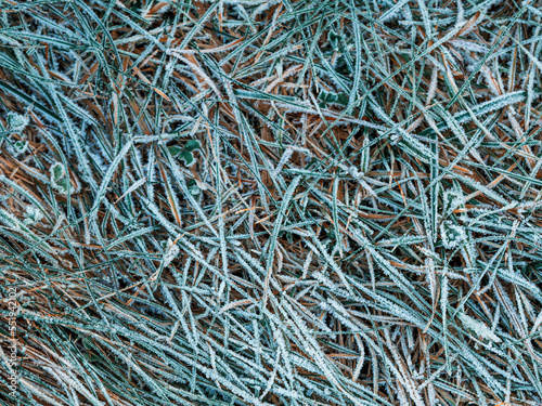 The grass is covered with frost. Beautiful natural background with hoarfrost on the grass. Ground texture with frozen meadow plants. Rime ice on blades of grass during frosts. Cold weather.