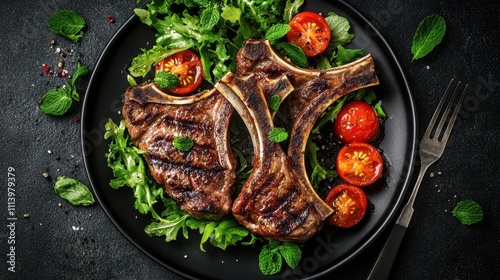meat, food, dish, grill, dinner, steak, plate, epicure, cookery, bar-b-q, tomatoes, herb, salad, mint, healthy, dining, eatery, lunch, beef, fresh, delicious, cooked, protein, high, quality, preparation, meal, alimentary, catering, platter, black
