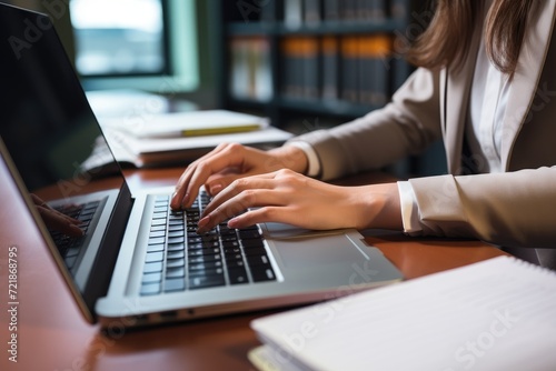 The hand of a businesswoman pressing a laptop keyboard on a table, focused on work, Ai Generated