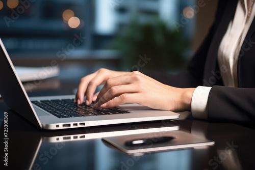 The hand of a businesswoman pressing a laptop keyboard on a table, focused on work, Ai Generated