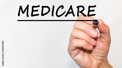 the hand writes the Word MEDICARE with a marker on a white background. business concept