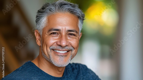 The Hispanic senior man, with greying hair and wrinkles around his eyes, beams a warm smile at the camera, his dark eyes sparkling with joy and kindness.