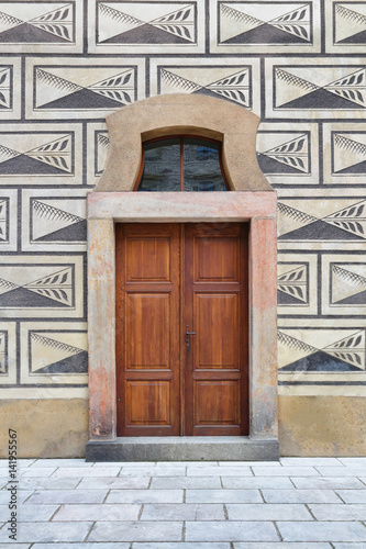 The historic oak doors with painted plaster Schwarzebersky Palace. Hradcany Square in Prague.