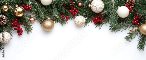 christmas, decoration, pine, branch, holiday, festive, ornament, berry, gold, white, red, background, seasonal, celebration, winter, greenery, new year, sparkle, party, cheer, nature, design, accessory, arrangement, texture, culture, tradition, aesthetic, home, cosy, joy, style